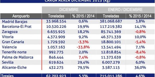 Durante el mes de diciembre, por los aeropuertos españoles de la red de Aena han pasado 62.702.923 kg de carga aérea, un 5,3% más que en el mismo mes de 2014. En cuanto a los datos acumulados, el tráfico de carga ha ascendido a 715.011.286 kg, que suponen un 4,6% más que en el mismo período de 2014.