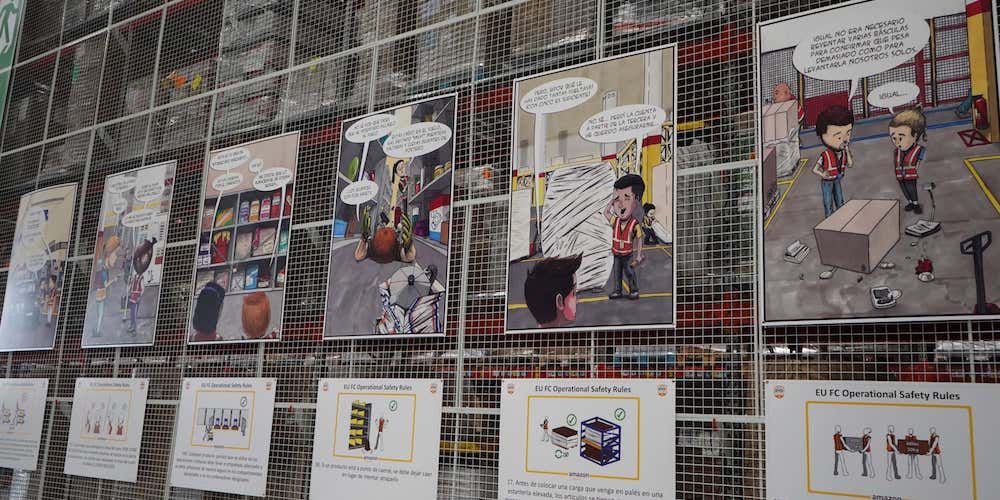 Con el firme propósito de recordar a los empleados de sus centros logísticos la importancia de la seguridad en el trabajo y todas las medidas que la multinacional pone a su disposición, Amazon decorará sus centros logísticos europeos con ilustraciones estilo cómic en gran formato.