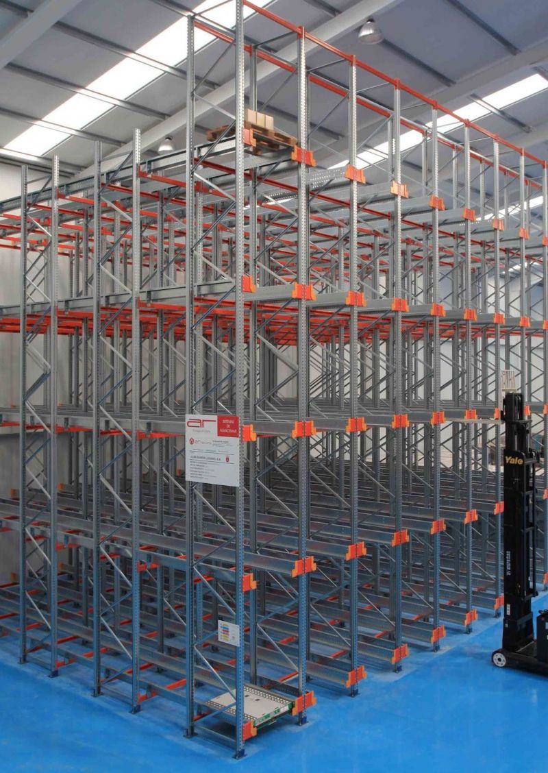 En concreto, se trata de una estantería de alta densidad de almacenaje diseñado para aprovechar al máximo espacio y altura disponible minimizando los pasillos de trabajo de la carretilla. De esta forma, se permite la carga y la recuperación automática de palets de forma continua mediante un sistema de control remoto, colocando las unidades de carga en la primera posición libre hasta que la estantería está llena o tomándolas desde su posición para llevarlas al borde y ser recogidas por la carretilla elevadora, hasta que la estantería está vacía.