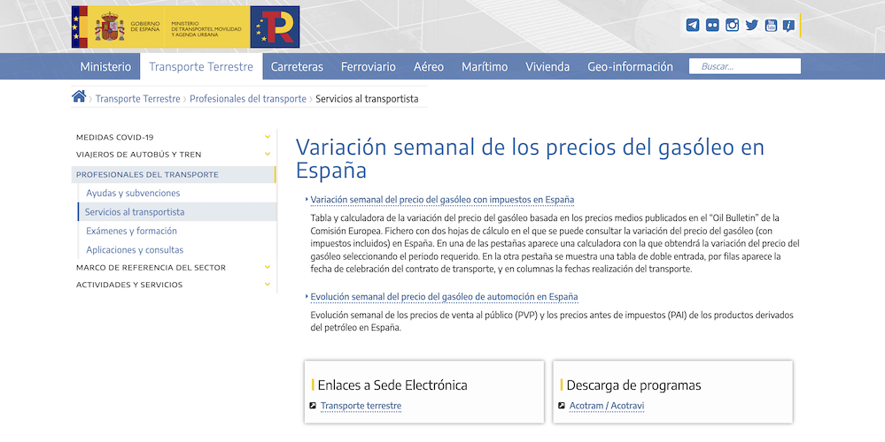 El Ministerio de Transportes, Movilidad y Agenda Urbana ya tiene operativa en su página web una tabla y una calculadora de la variación del precio del gasóleo basada en los precios medios publicados por la Comisión Europea.