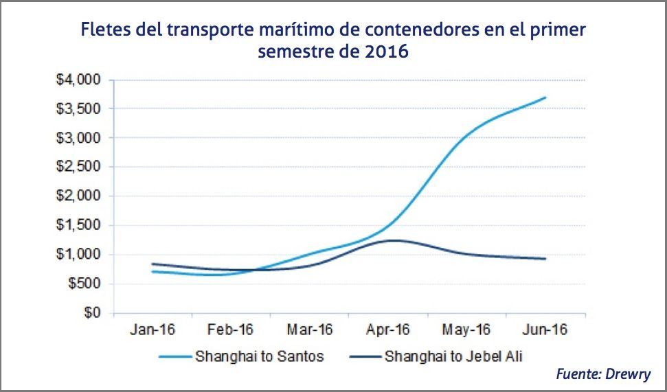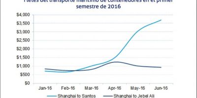 Los fletes de los contenedores en el transporte marítimo entre el puerto chino de Shanghai y el puerto brasileño de Santos, los dos principales puertos de Asia y Sudamérica, están experimentando en 2016 un impulso desconocido en un sector que se caracteriza por la lenta subida de los precios tras caídas pronunciadas.