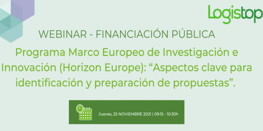 La Plataforma Logistop organiza el día 25 de noviembre un webinar bajo el título de 'Financiación Pública - Programa Marco Europeo de Investigación e Innovación Horizon Europe: aspectos clave para identificación y preparación de propuestas'.