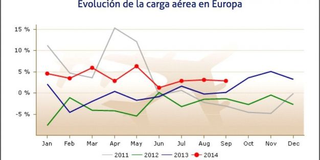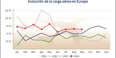 En lo que respecta al mes de septiembre, la carga aérea ha aumentado un 2,9% con respecto al mismo mes de 2013. En comparación con septiembre de 2011, este incremento asciende a un 6,9%.