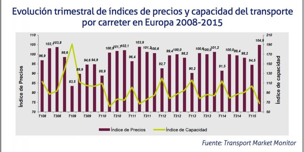 En la XXIV Edición del “Transport Market Monitor”, elaborado por Capgemini Consulting con la colaboración de Transporeon, se recoge un aumento del 10,4%, es decir, un índice 104,9 en el precio del transporte durante el segundo trimestre de 2015, en comparación con el trimestre anterior. Con respecto al primer trimestre de 2014, esta cifra se incrementa un 4,9%.