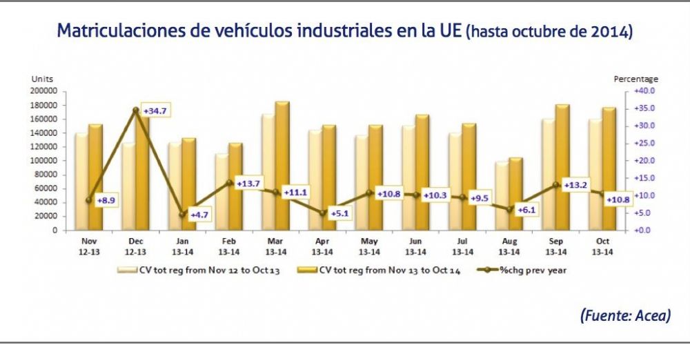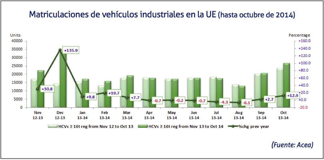 Entre los diez primeros meses del año, el mercado de la Unión Europea ha crecido un 4,3%, alcanzando las 175.701 unidades. Este incremento ha sido posible por el crecimiento en el mercado español (+31,7%), alemán (+14,7%) e italiano (+12,5%), mientras que las matriculaciones de vehículos industriales en Francia (-9,8%) y en Reino Unido (-10%) siguen cayendo.
