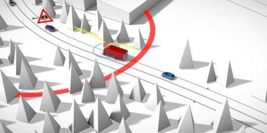 Mientras que el conductor sólo ve una curva, el sistema de navegación ya sabe que detrás de ella hay hielo en la calzada o un atasco de tráfico. De esa manera, se puede evitar que un coche o un camión circulen deprisa al aproximarse al lugar de un accidente o a una caravana de coches. El sistema puede avisar al conductor o iniciar automáticamente una operación de frenado.