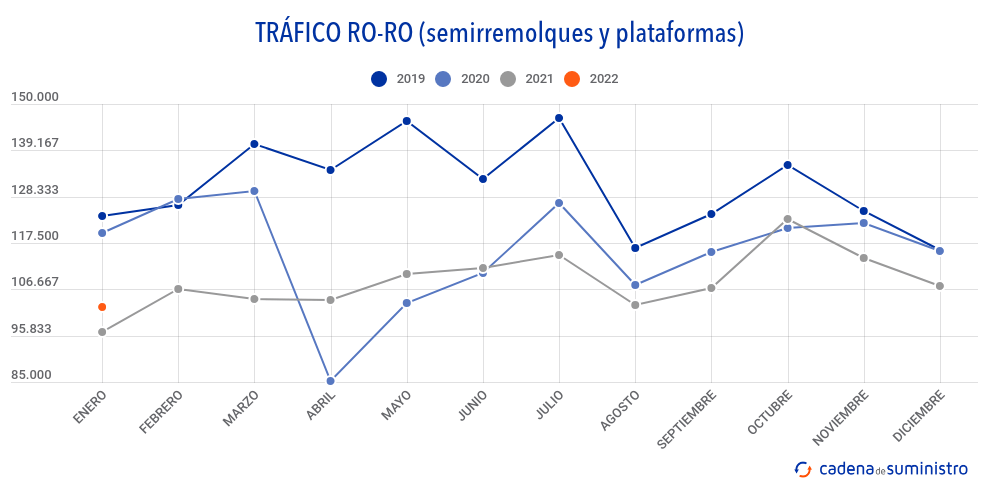 Por lo que respecta al movimiento de remolques, semirremolques y plataformas en régimen ro-ro, durante el pasado enero, Baleares ha movido 20.725 unidades, un 502,3% anual más.