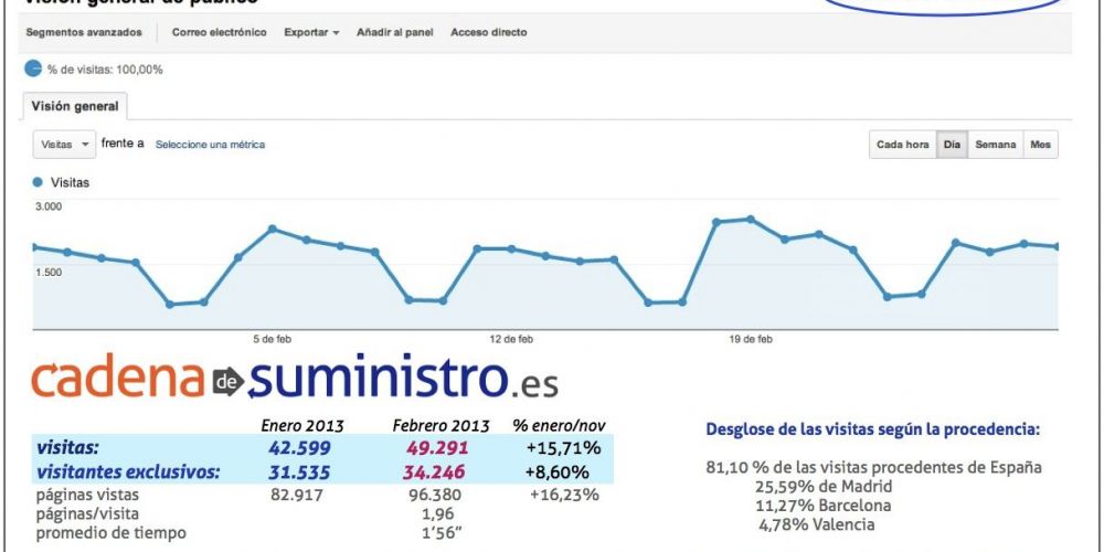 El portal cerró el ejercicio 2012 con más de 40.000 visitas mensuales y en los dos últimos meses esta cifra ha aumentado hasta alcanzar las 49.291 visitas en febrero, un mes de tan solo 28 días, según confirman las estadísticas proporcionadas por Google Analytics, la herramienta de medición de audiencias que ofrece información real y actualizada sobre el tráfico de sitios webs, que se ofrece una vez más como confirmación incontestable de los datos aquí ofrecidos. De hecho hace unos días ya se han superado las 51.000 visitas en el intermensual, lo que confirma nuevamente la tendencia alcista.