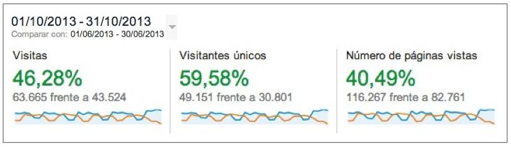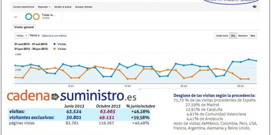 El portal, que en los meses previos al período estival alcanzaba las 50.000 visitas mensuales, ha continuado incrementando las visitas, superando la barrera de las 63.600 visitas en octubre (+46,28% respecto a junio) y de las 3.000 visitas diarias de L a V, según confirman las estadísticas proporcionadas por Google Analytics, la herramienta de medición de audiencias que ofrece información real y actualizada sobre el tráfico de sitios webs, que se ofrece una vez más como comprobación de los datos aquí enumerados.