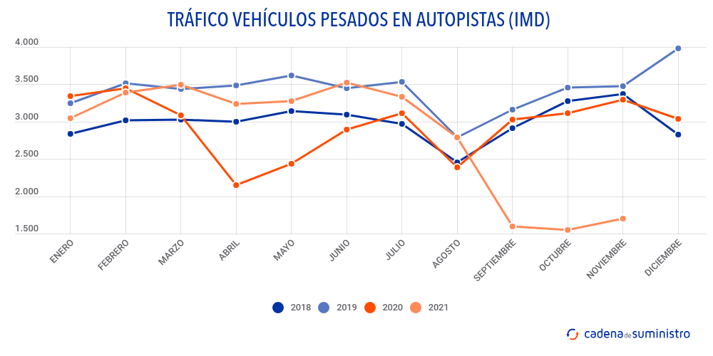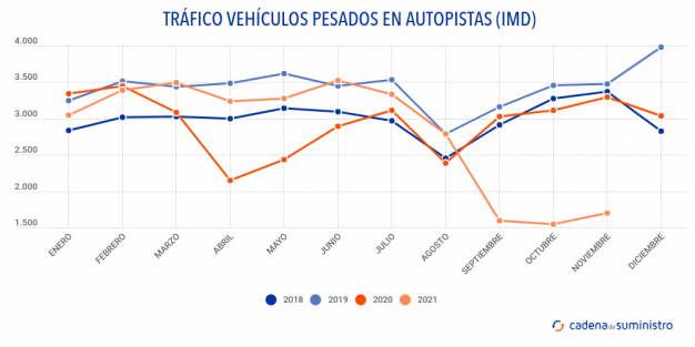 En este mismo sentido, el pasado mes de noviembre se registró en las carreteras de pago del país un total de 72 millones de vehículos pesados kilómetro, un 61,5% menos que en idéntico mes de 2020.