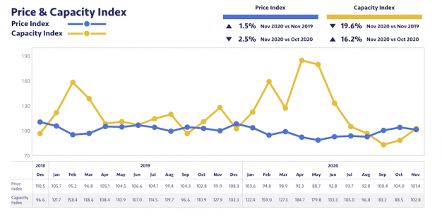 Así pues, la capacidad del sector en Europa registra un índice mensual en noviembre de 102,8 puntos, aún lejos de los datos de hace un año, por efecto de la crisis sanitaria.