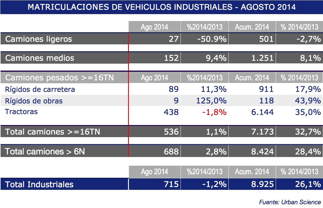 El mercado de vehículos industriales en agosto ha registrado un descenso del 1,2% en comparación con agosto de 2013, frenándose la tendencia positiva registrada hasta julio. La mayor caída la ha experimentado el segmento de los camiones ligeros, con una bajada en las matriculaciones del 50,9%, mientras que los vehículos medios han aumentado un 9,4% según los datos aportados por Aniacam.