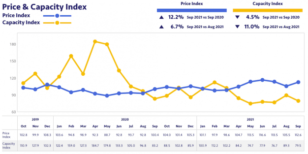 Por otra parte, la capacidad de la flota europea de transporte presenta un retroceso de un 11% entre agosto y septiembre de 2021, y al mismo tiempo sigue un 4,5% por debajo del dato de hace un año.
