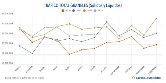 En los primeros siete meses de 2023, el sistema portuario del país totaliza 102.605.289 toneladas de graneles líquidos, un 4,6% menos que hace un año, y 54.496.265 toneladas de graneles sólidos, un 2% anual más.