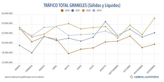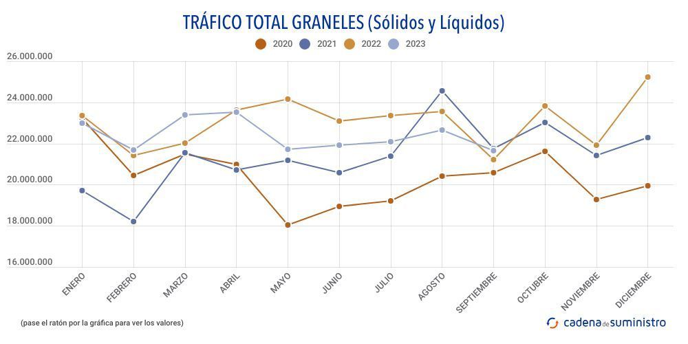 En los primeros nueve meses de 2023, el sistema portuario del país totaliza 131.427.690 toneladas de graneles líquidos, un 3,7% menos que hace un año, y 69.546.281 toneladas de graneles sólidos, un 0,2% anual más.