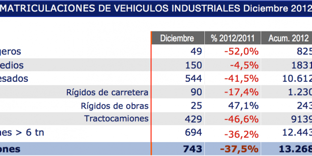 La caída media del mercado de camiones es del 22%, respecto a 2011. Por segmentos, los camiones pesados de menos de 16 tn han caído un 18,3%, Respecto a los segmentos de camiones rígidos de obras y rígidos de carretera registran caídas superiores al 40%, con volúmenes de mercado casi testimoniales.