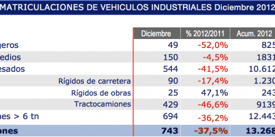 En cuanto a camiones medios se han registrado 1.831 vehículos, lo que supone un descenso del 26,3% respecto al 2011. Por su parte, los camiones ligeros retroceden más del 47% con 825 unidades frente a las 1.569 del año anterior. Los camiones de más de 6 tn han caído un 19,6% registrando un total de 12.443 vehículos.