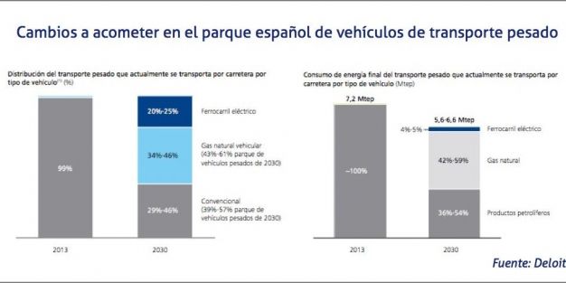 Según el informe, en el ejercicio 2030, entre el 20% y el 25% de los vehículos pesados deberían haber trasladado su carga al ferrocarril, que además debería ser eléctrico, y alrededor del 50% del total de vehículos pesados deberían estar propulsados por gas natural.