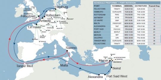 De momento, con la idea de prestar servicio en el norte de Europa hacia y desde el mercado turco de Alejandreta, se implementará un servicio de transporte Líbano-Alejandreta que conectará el norte de Europa con Alejandreta y la carga de Alejandreta con el norte de Europa mediante transbordo en Beirut.