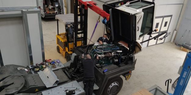 El equipo cuenta con una cadena cinemática híbrida de pila de combustible y batería que permite al vehículo realizar todas las tareas intensivas que se requieren durante las operaciones de carga y descarga.