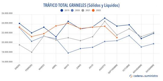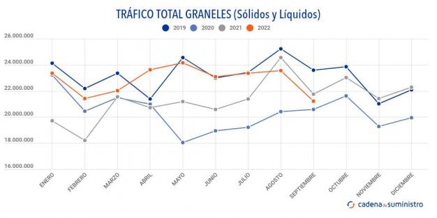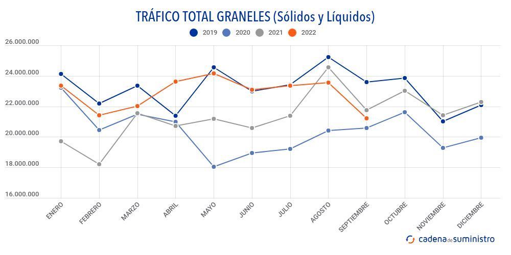 Durante el pasado mes de septiembre, los puertos españoles han movido 13.338.602 toneladas de graneles líquidos, un 6,05% menos que hace un año, y 7.894.453 toneladas de graneles sólidos, un 6,26% anual más.