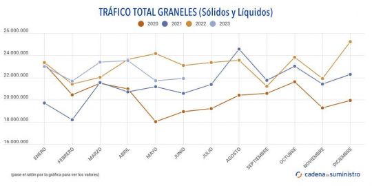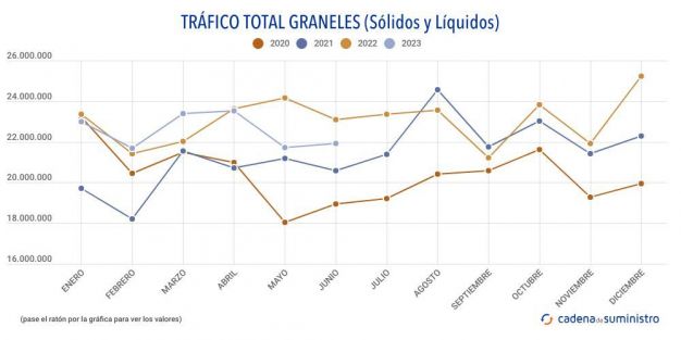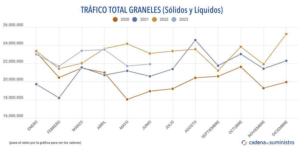 En la primera mitad de 2023, el sistema portuario del país totaliza 87.778.735 toneladas de graneles líquidos, un 3,92% menos que hace un año, y 47.260.044 toneladas de graneles sólidos, un 2,12% anual más.