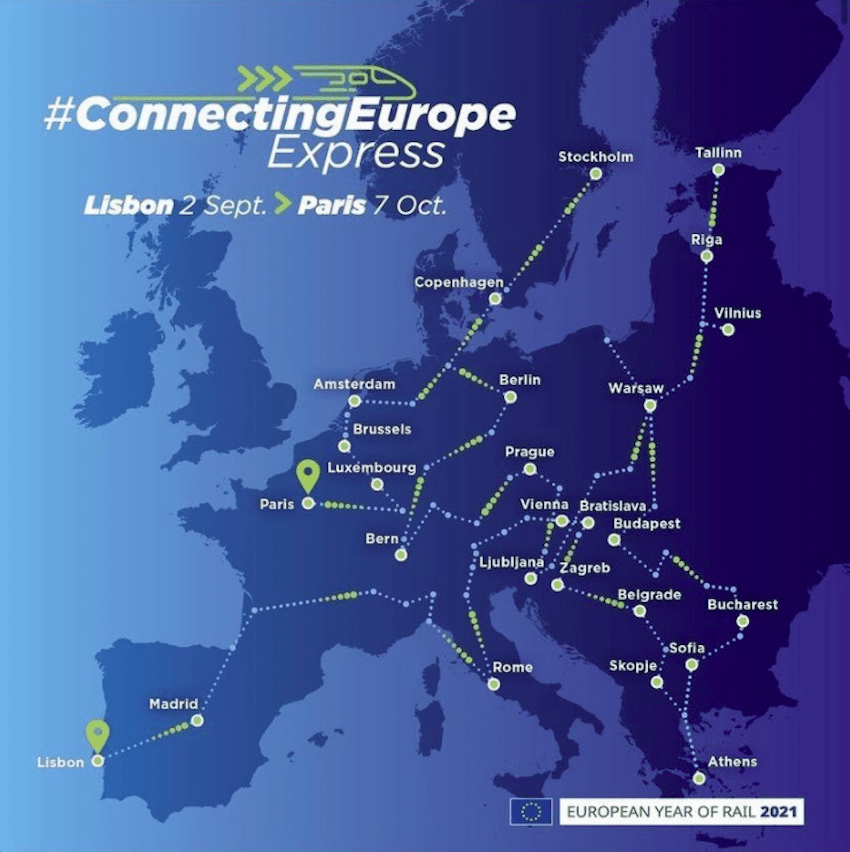 Desde su salida, el pasado 2 de septiembre en Lisboa, hasta la llegada el 7 de octubre a París, el tren Connecting Europe Express recorrerá 26 países europeos, con eventos y diferentes actividades en las más de cien ciudades en las que hará parada.