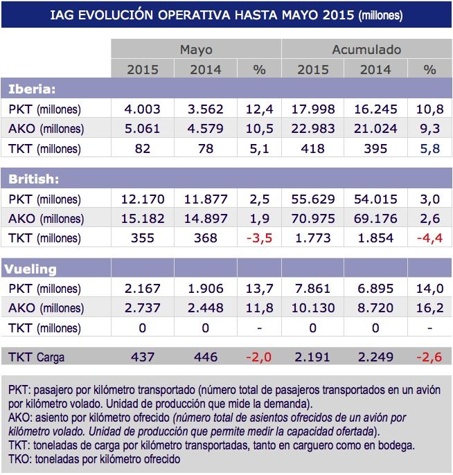 El grupo IAG ha publicado los resultados del mes de mayo de 2015, en el que se recoge el tráfico de mercancías con una TKT Carga (toneladas de carga por kilómetro transportadas) de 437 millones de toneladas, lo que supone un descenso del 2,0% respecto al mismo mes de 2014.