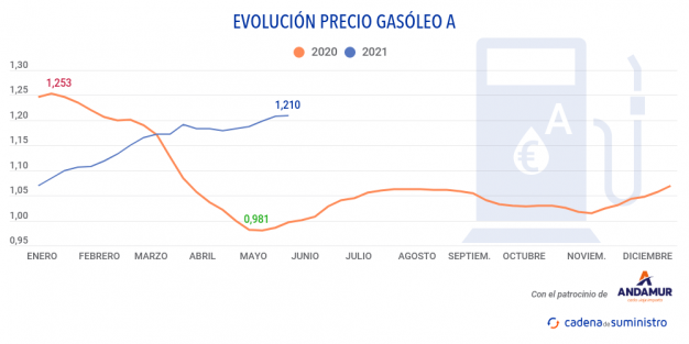 Entre los días 18 y 24 de mayo de 2021, el precio del gasóleo se ha situado en los 1,210 euros, alcanzando un nuevo máximo al superar en un 0,16% los 1,208 euros por litro de la semana anterior, según los datos proporcionados semanalmente por el Boletín Petrolero de la Unión Europea.