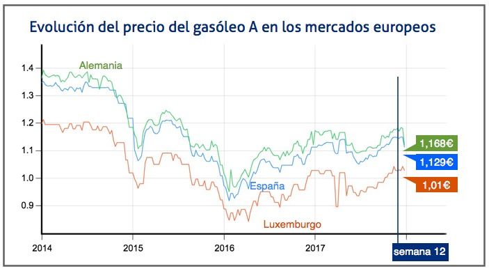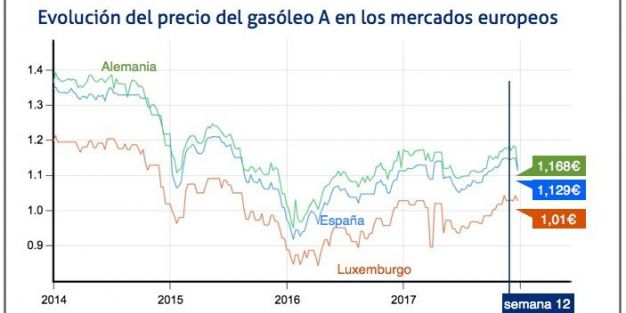 En cuanto a los datos de otros países europeos, el precio más bajo en el gasóleo esta semana es el de Luxemburgo, con 1,01 euros por litro, mientras que Suecia ha registrado el precio más elevado, con 1,433 euros.