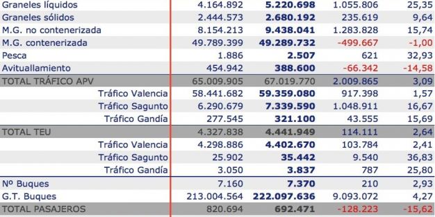 Durante el ejercicio 2014, los puertos gestionados por Valenciaport han canalizado un total de 67.019.770, lo que supone un crecimiento del 3,09% respecto a 2013 y alcanzar la cifra más alta en la historia del recinto.