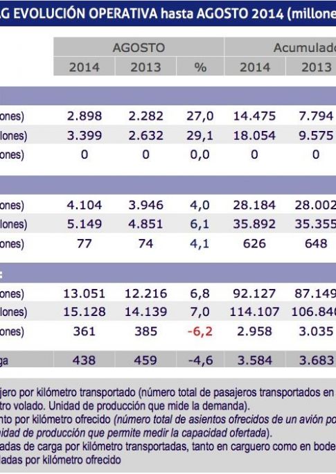El grupo IAG ha publicado los resultados del mes de agosto en el que se recoge el tráfico de mercancías con una TKT Carga (toneladas de carga por kilómetro transportadas) de 438 millones de toneladas, lo que supone un descenso del -4,6% respecto al mismo mes de 2013.