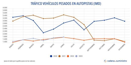 Dicha cifra indica que el tráfico pesado de las autopistas de peaje del país constituye el 11,55% del total de vehículos que han utilizado estas vías a diario durante el período, que, según los últimos datos reportados por el Ministerio de Transporte, Movilidad y Agenda Urbana, suma un total de 15.779 vehículos al día de media, cifra que, a su vez, implica un ascenso anual de un 3,64%.
