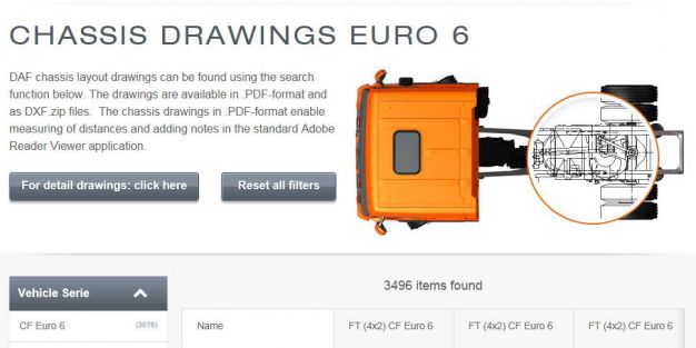 Los usuarios pueden localizar las hojas de especificaciones necesarias aún más rápido, y pueden incluso descargar varias hojas a la vez. La función de búsqueda optimizada hace que sea más rápido y más fácil encontrar el plano del chasis adecuado.