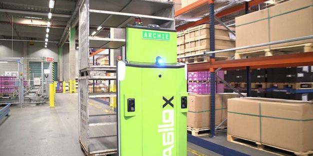 Este dispositivo, de la marca austriaca Agilox, puede transportar contenedores vacíos a una distancia de 150 metros sin intervención humana. Su implementación en sustitución de las carretillas elevadoras convencionales puede facilitar el trabajo de los empleados, gracias a la automatización de los procesos.