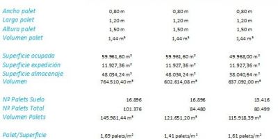 Si partimos de una nave logística ejemplo de 60.000 m² (en la tabla en columna 1) con las dimensiones ideales vemos que los 4,50 €/m²&mes que paga el operador a los inversores inmobiliarios propietarios de la nave logística se traducen en 2,66 €/palet&mes.