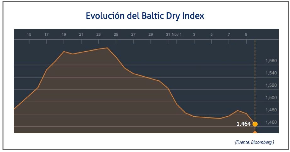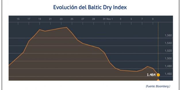 El Baltic Dry Index, BDI, que refleja los precios de los fletes de los buques graneleros tomando como referencia 23 rutas marítimas, ha descendido el 10 de noviembre de 2017 hasta los 1.464 puntos, lo que supone una disminución de 17 puntos o del 1,15%.