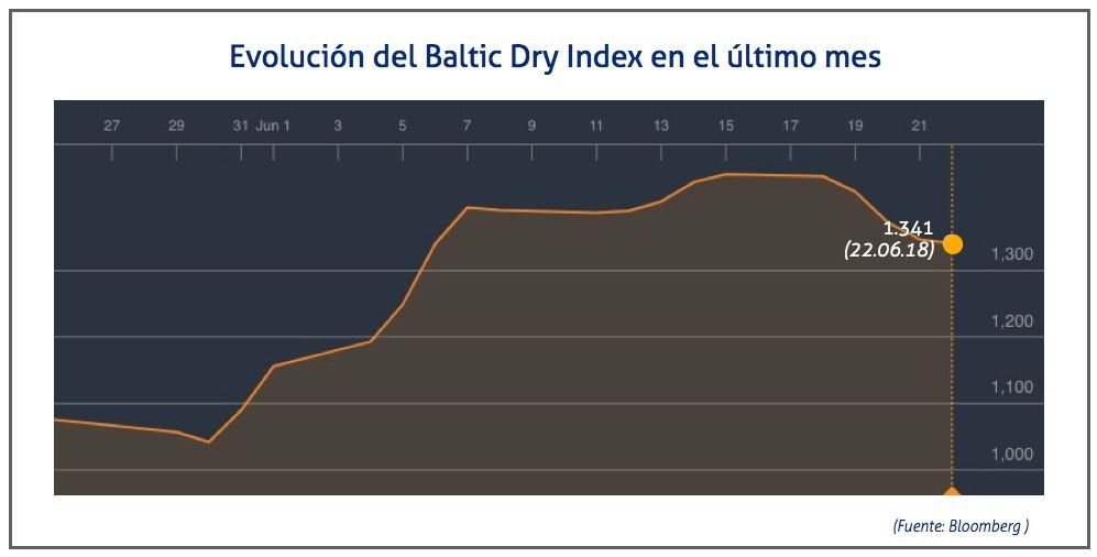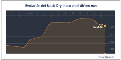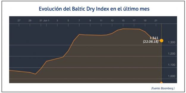 El Baltic Dry Index, BDI, que refleja los precios de los fletes de los buques graneleros tomando como referencia un total de 23 rutas marítimas, ha descendido el viernes día 22 de junio de 2018 hasta los 1.341 puntos, lo que supone una caída de seis puntos o del 0,45%.