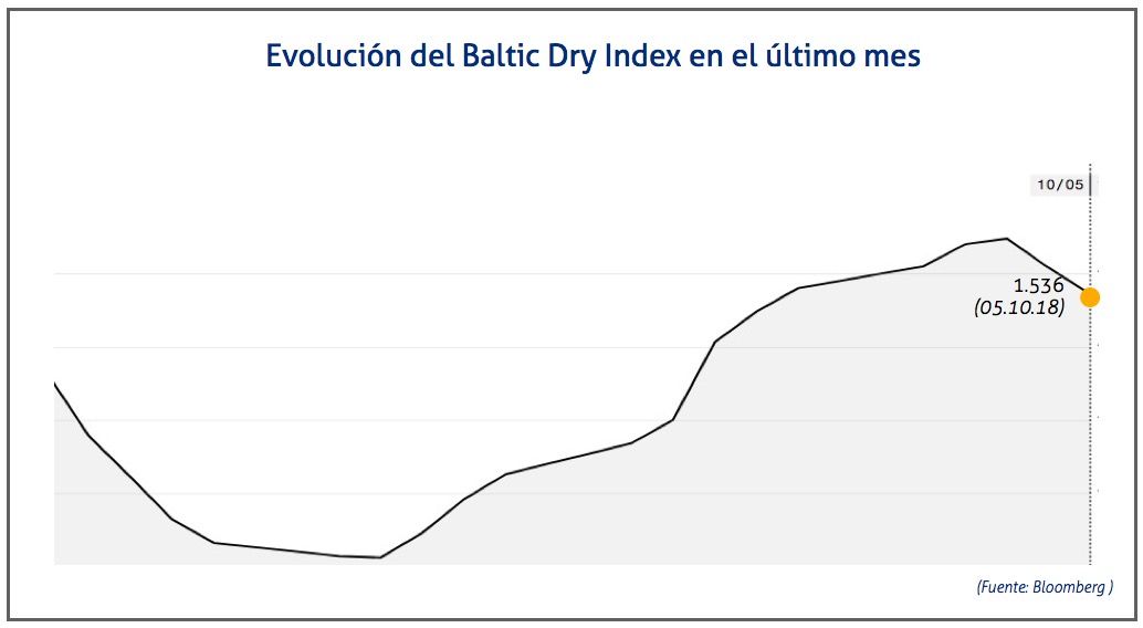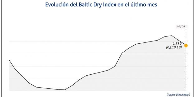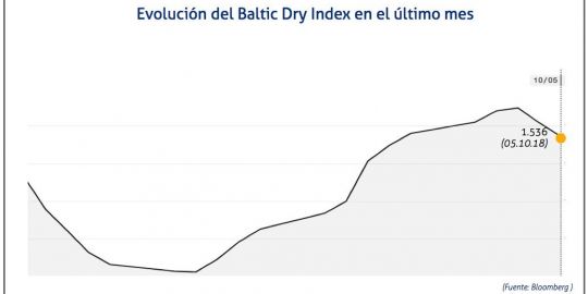 El Baltic Dry Index, BDI, que refleja los precios de los fletes de los buques graneleros tomando como referencia un total de 23 rutas marítimas, ha aumentado el viernes 5 de octubre de 2018 hasta los 1.536 puntos, lo que supone un descenso de 18 puntos o del 1,16%.