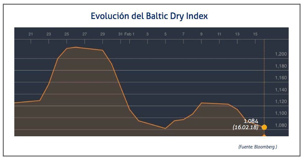 El Baltic Dry Index, BDI, que refleja los precios de los fletes de los buques graneleros tomando como referencia 23 rutas marítimas, ha caído el viernes 16 de febrero de 2018 hasta los 1.084 puntos, lo que supone un descenso de cinco puntos o del 0,46%, al que han contribuido todos los segmentos.