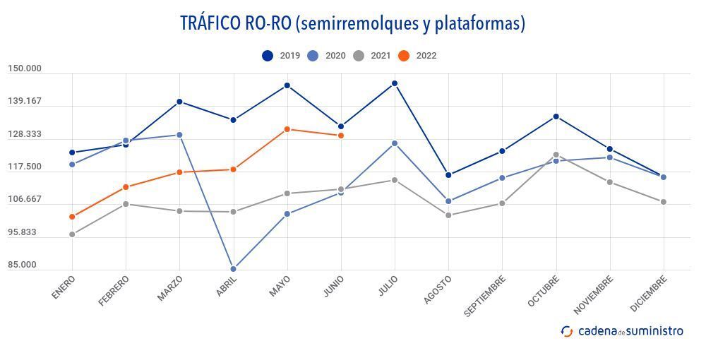 De igual modo, en el mes se han registrado un total de 129.409 remolques, semirremolques y plataformas en régimen ro-ro, un 29,86% más que en idéntico período del año pasado.