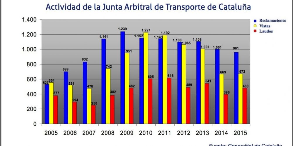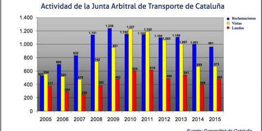 La Junta Arbitral del Transporte de Cataluña ha publicado los datos de su actividad durante 2015. En total, ha registrado 961 reclamaciones, lo que supone un 4% menos respecto al ejercicio anterior.
