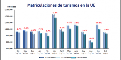 Los resultados de octubre fueron diferentes entre los países, lo que lleva a un descenso global del 4,8% en la UE. Mientras que el mercado alemán se mantuvo bastante estable, con un crecimiento del 0,5%, el Reino Unido se expandió un 12,1%. Los demás mercados importantes mantuvieron su tendencia a la baja, con unos resultados peores que los de octubre de 2011, Francia cayó un 7,8% e Italia descendió 12,4%. El peor dato lo registra España con un significante retroceso del 21,7%.