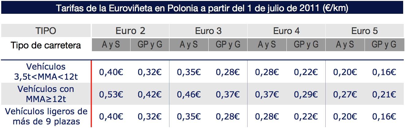 Las tarifas establecidas (euros/km) para cada categoría de vehículo, dependiendo de su MMA y la clasificación EURO, así como de la catalogación que las autoridades polacas realizan de sus vías públicas, son las siguientes:
