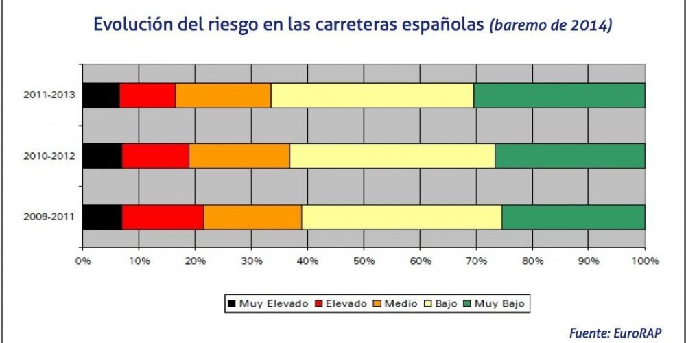 Con respecto a dicha muestra, en un total de 1.279 km, un 5,2% del total, los conductores experimentan un riesgo "muy elevado" de sufrir un accidente grave o mortal, mientras que el peligro se mantiene "elevado" en un 10,8% de la Red, que comprenden 2.669 km.