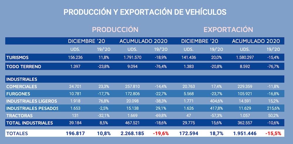 Respecto a los industriales pesados, en diciembre se han exportado un 417,8% anual más, con 1.626 unidades, y en cuanto a las tractoras, en el mes se han exportado 47, un 57,3% menos que en idéntico mes de 2019.