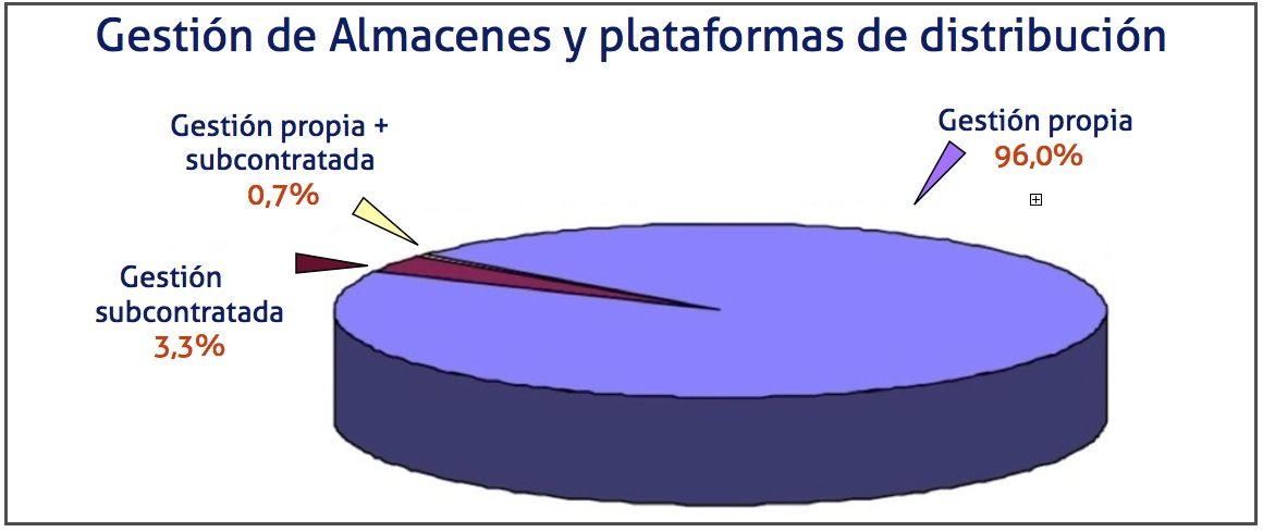 Según DBK, el 96% de las empresas consideradas en el informe, llevan a cabo internamente la gestión de los almacenes y plataformas de distribución para el comercio electrónico, mientras que sólo el 4% tienen externalizada la gestión total o parcial a operadores logísticos.