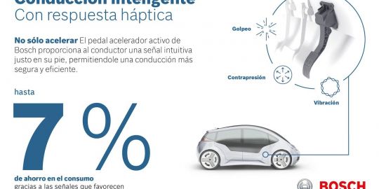 Sin embargo, Bosch ha desarrollado una ayuda técnica en forma de pedal de acelerador activo que advierte a los conductores, mediante una suave vibración, cuándo han cruzado la línea entre acelerar con suavidad a pisar el pedal a fondo.