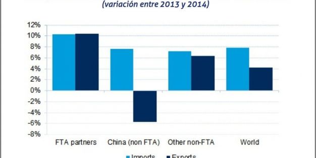 No obstante, el impulso ha sido mayor en el último lustro. Entre 2009 y 2014, las exportaciones hacia países con tratados de libre comercio han crecido en un 64% frente al 45% del resto, mientras que las importaciones procedentes de dichos países se han ampliado en un 57%, frente al 47% de aquellos sin convenios.