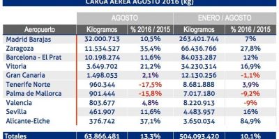 Durante el octavo mes de 2016, los aeropuertos españoles de la red de Aena han transportado 63.866.481 kg de carga aérea, un 13,3% más que en agosto de 2015, situando el acumulado del ejercicio en 504.093.420 kg, un 10,1% más que la carga manipulada durante los ocho primeros meses del ejercicio anterior.